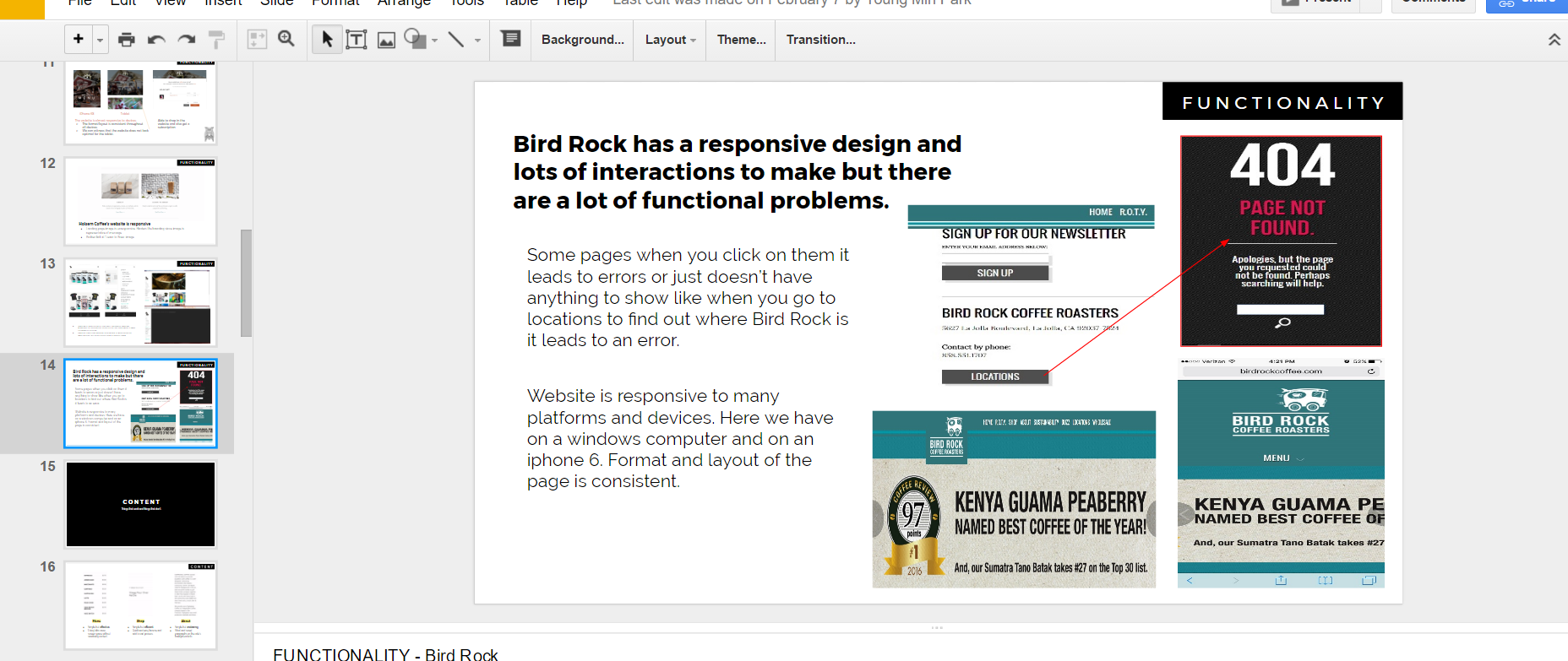cafes, created low and high resolution wireframes and prototypes, and implementing our design into a tangible product for our client.
