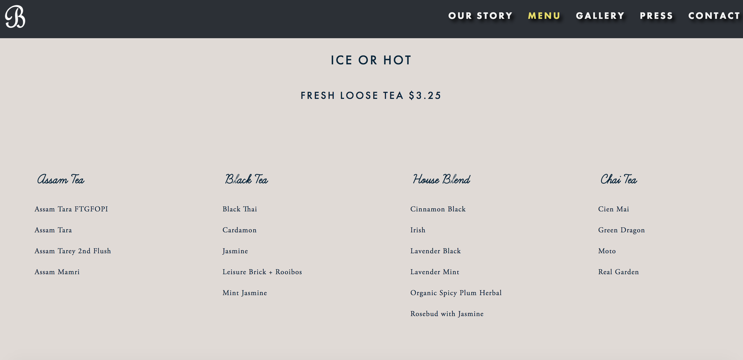 I was in charge of the menu page. Using html and css I coded a responsive menu page. It was really hard using tables in html especially when trying to organize all the different types of items on the menu page. The many different kinds of tea's they had gave me a difficult time trying to sort them and arrange things in a way users can easily see.