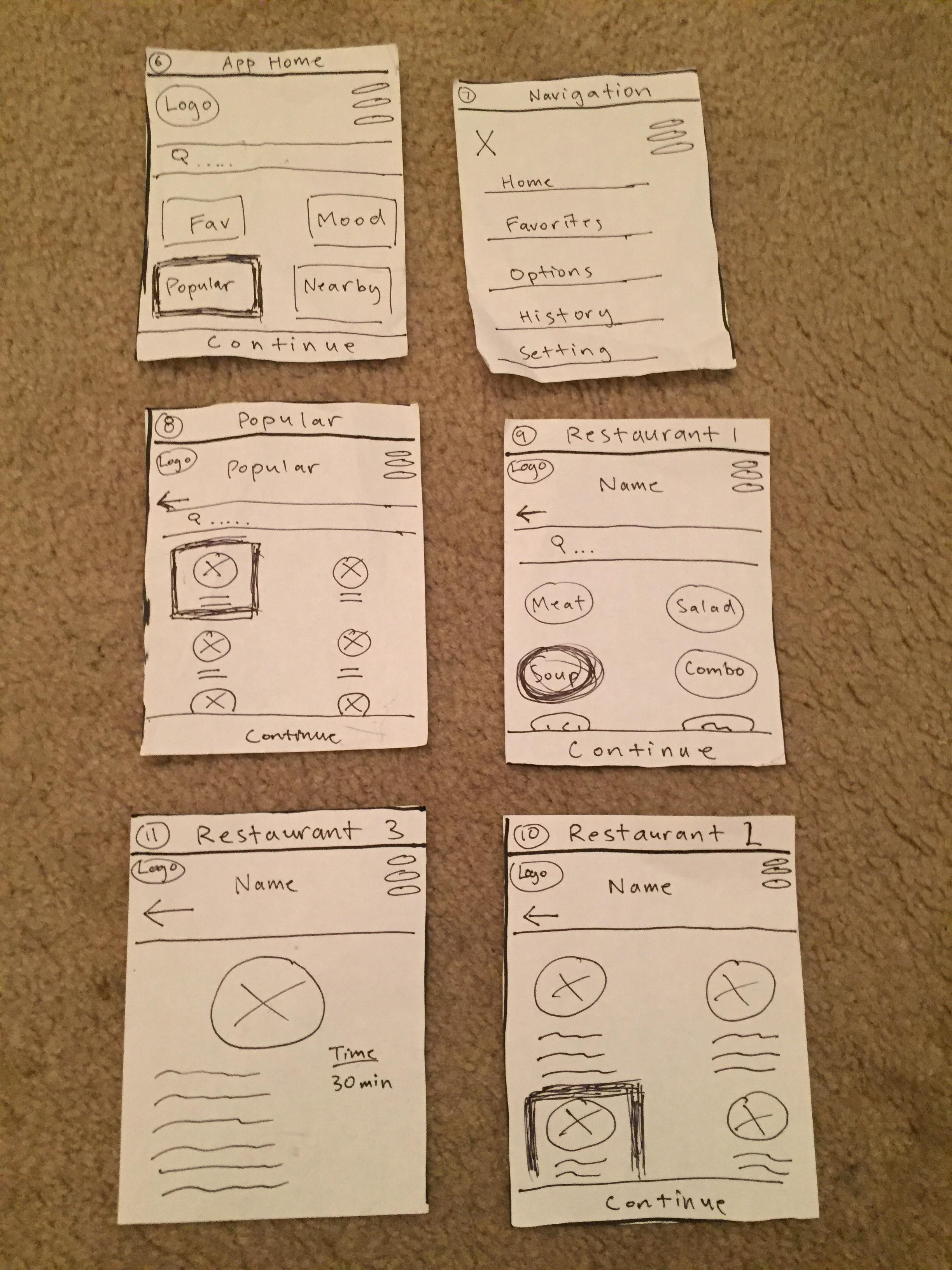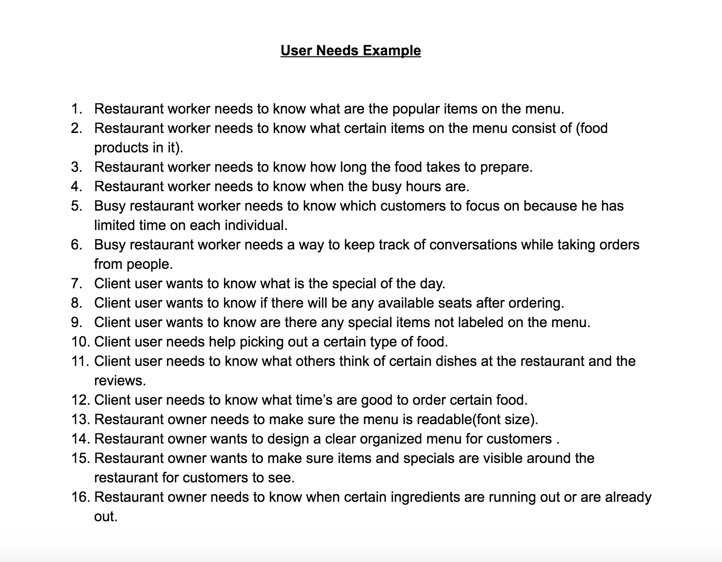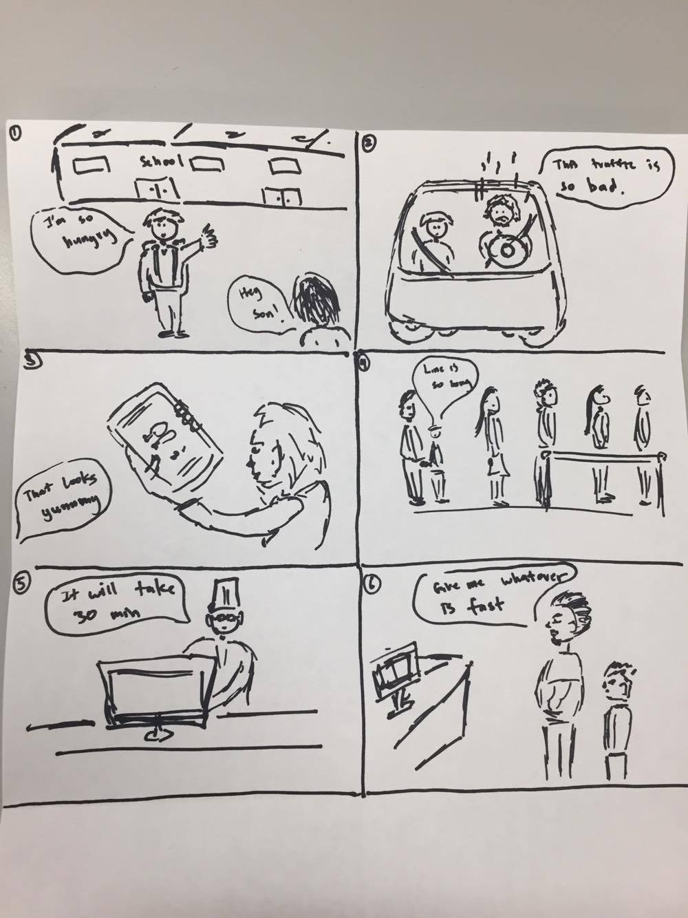 We decided something as simple as deciding on what food to order because it was something that happens often in our everyday lives. We did our needfinding by observing users in resturants on how they order. I came up with a list of user needs from our findings and created storyboards.