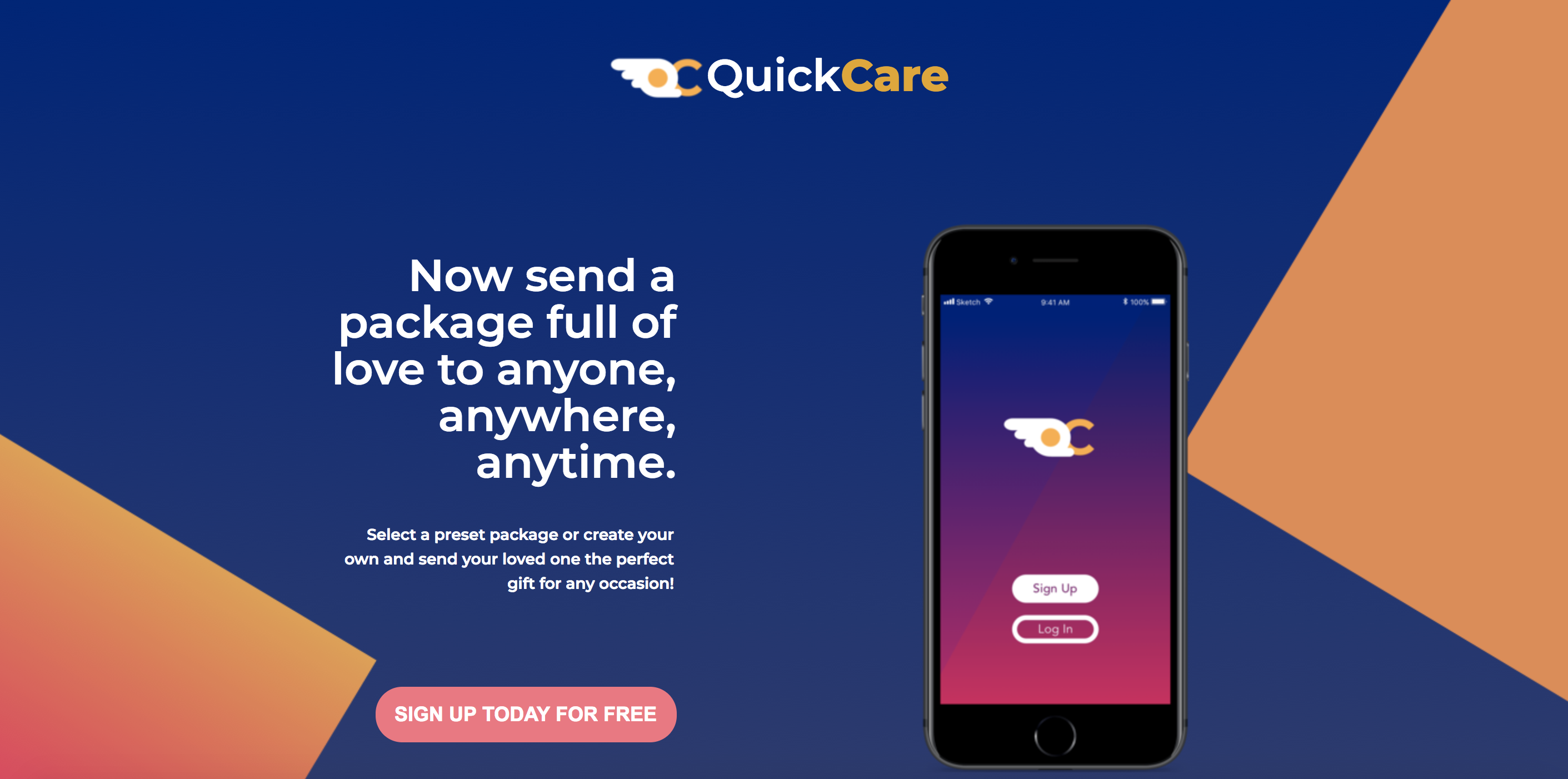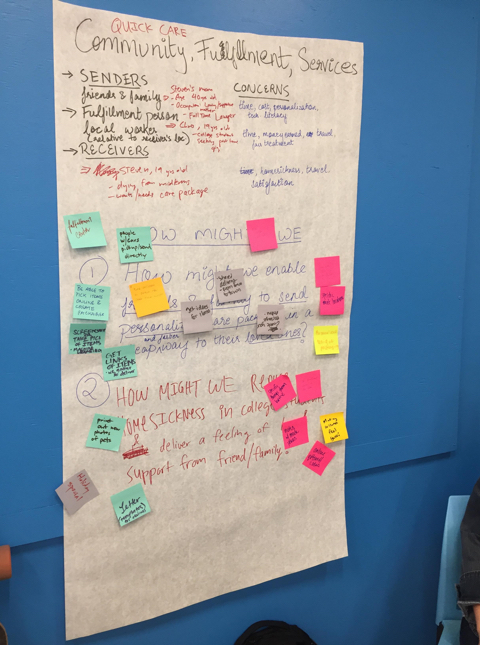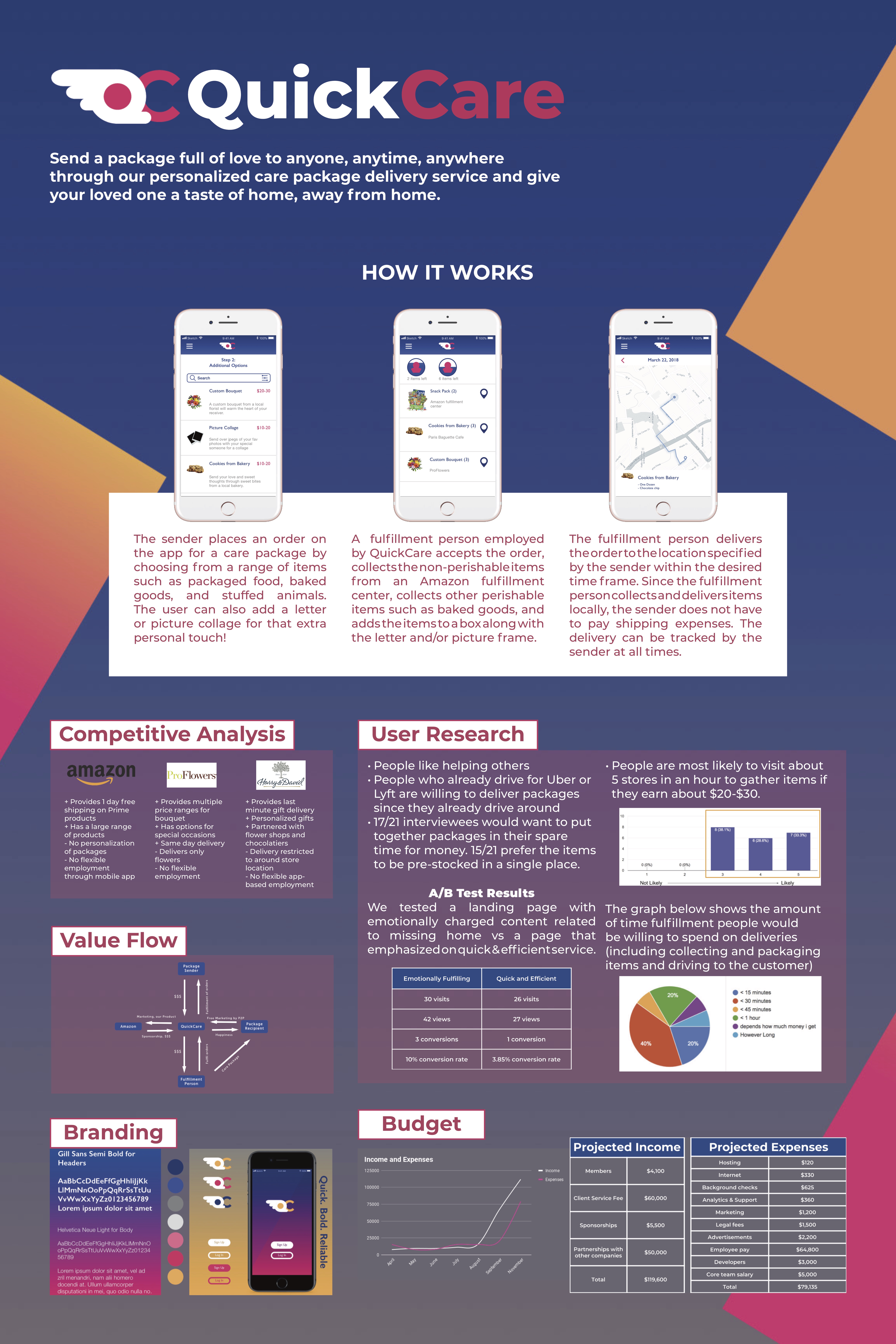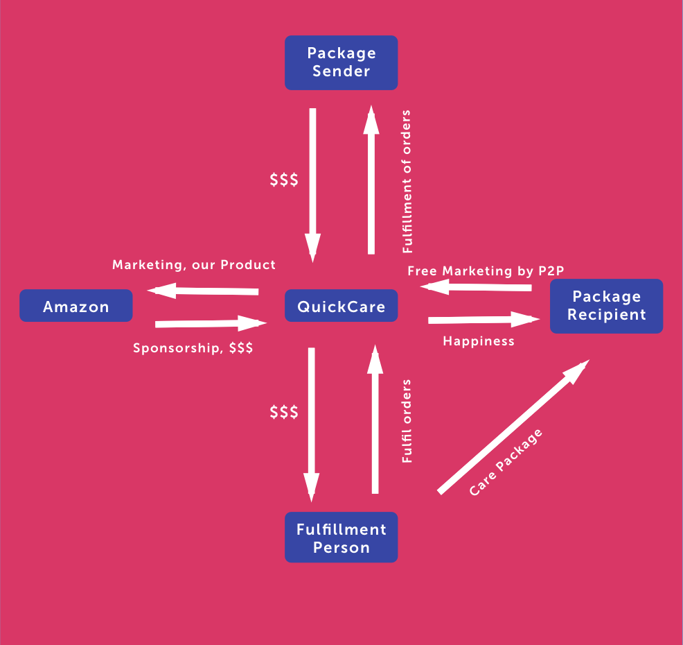 From our research online and user interviews we found that sometimes shipping can cost a lot and it can take a long time to deliver something to someone else. We came up with QuickCare which is a customized care package delivery service. The sender finds a package they like and can add customization to it and when the order is sent, a fulfilment person on the other end accepts the order and puts the package together and delivers it to the reciever.