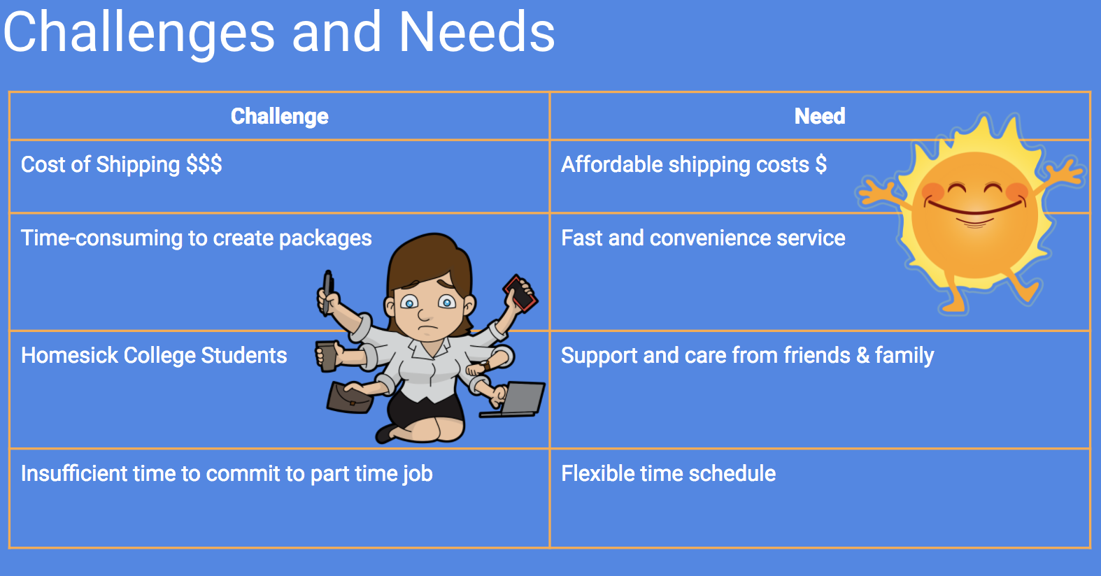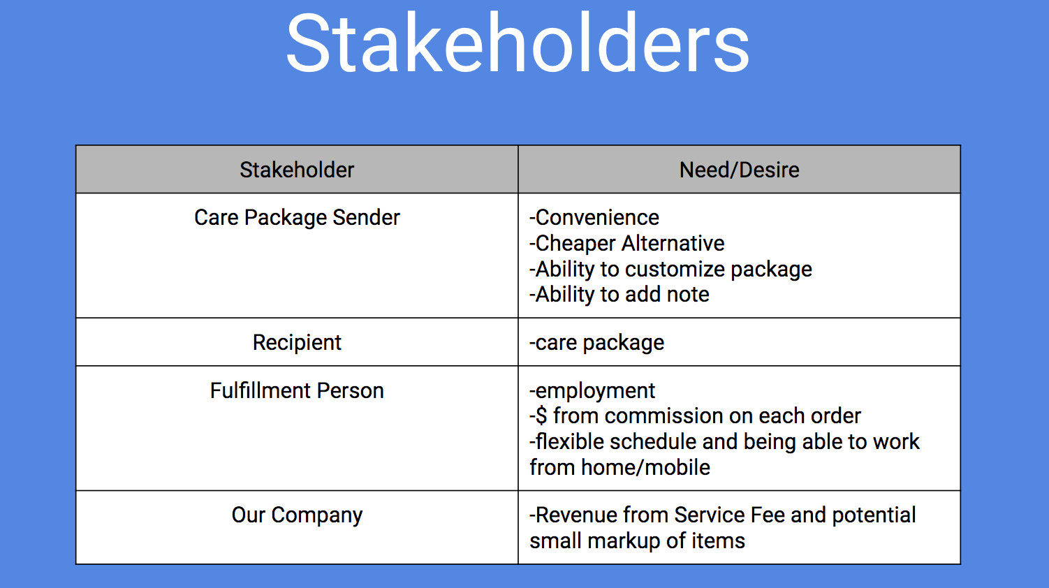 After doing research we then analyzed our potential stakeholders and made a list of their needs/desires and challenges.