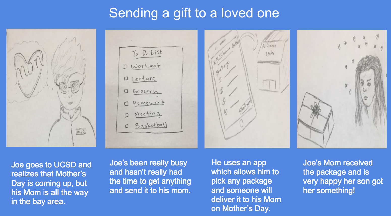 This was my final project for my COGS122 Interaction Design Startup class. I joined a group of 4 other members to come up with a buisness startup idea. Our Idea was on delivering customized care packages. In this project, I did online surveys, speed dating guides, storyboards, value propositions, branding, unbounce landing pages, and startup buisness model.